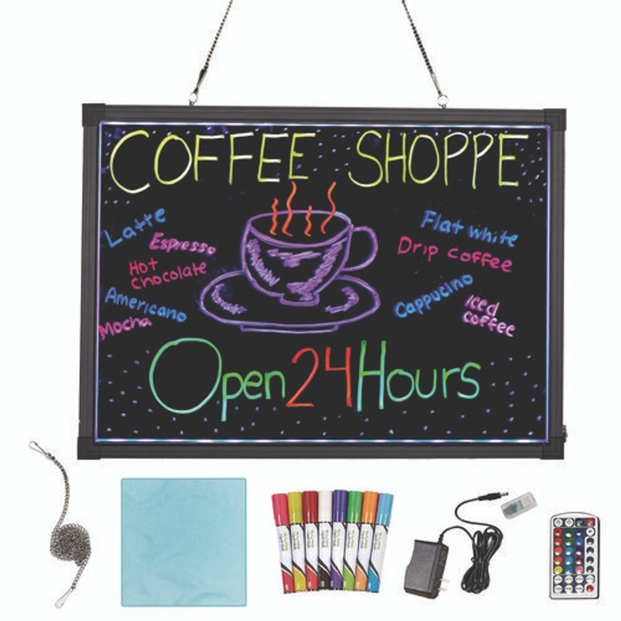 Package Includes: (1) Power Adapter; (8) Colored Marker Pens; (1) Remote Control; (1) Erasing Towel; (1) Hanging Chain; Clear User's Manual