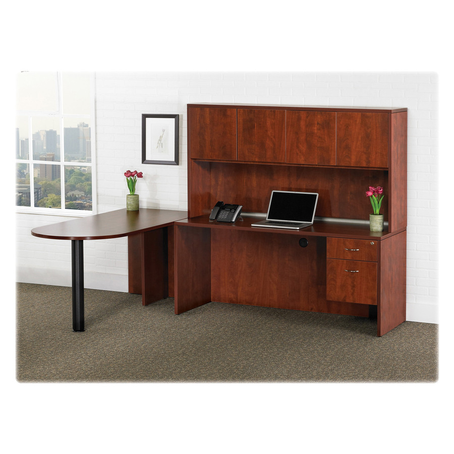 Rectangular desk shell is part of Lorell Essentials Series Laminate Furniture with high-quality laminate construction and metal-to-metal, cam-lock connections. Mahogany laminate top is 1" thick for durability. Use the two grommet holes in the top for easy cord routing. Design also includes a full modesty panel for privacy, 3mm PVC edges and adjustable feet.
