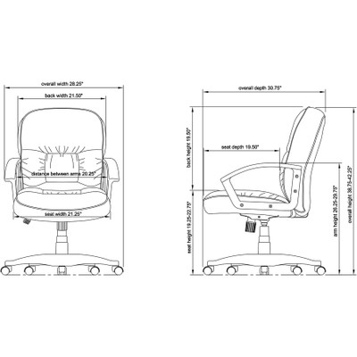 Managerial mid-back chair is fully upholstered with black, bonded leather. Black frame features stylish, open loop arms and a five-star nylon base with dual-wheel hard casters for easy mobility. Functions include pneumatic seat-height adjustment, 360-degree swivel, tilt, tilt tension and tilt lock. Capacity is 275 lb. Seat measures 20-1/2" wide x 17-1/2" deep. Back features a 3" thick cushion for your comfort and offers a size of 20" wide x 20-3/4" high.