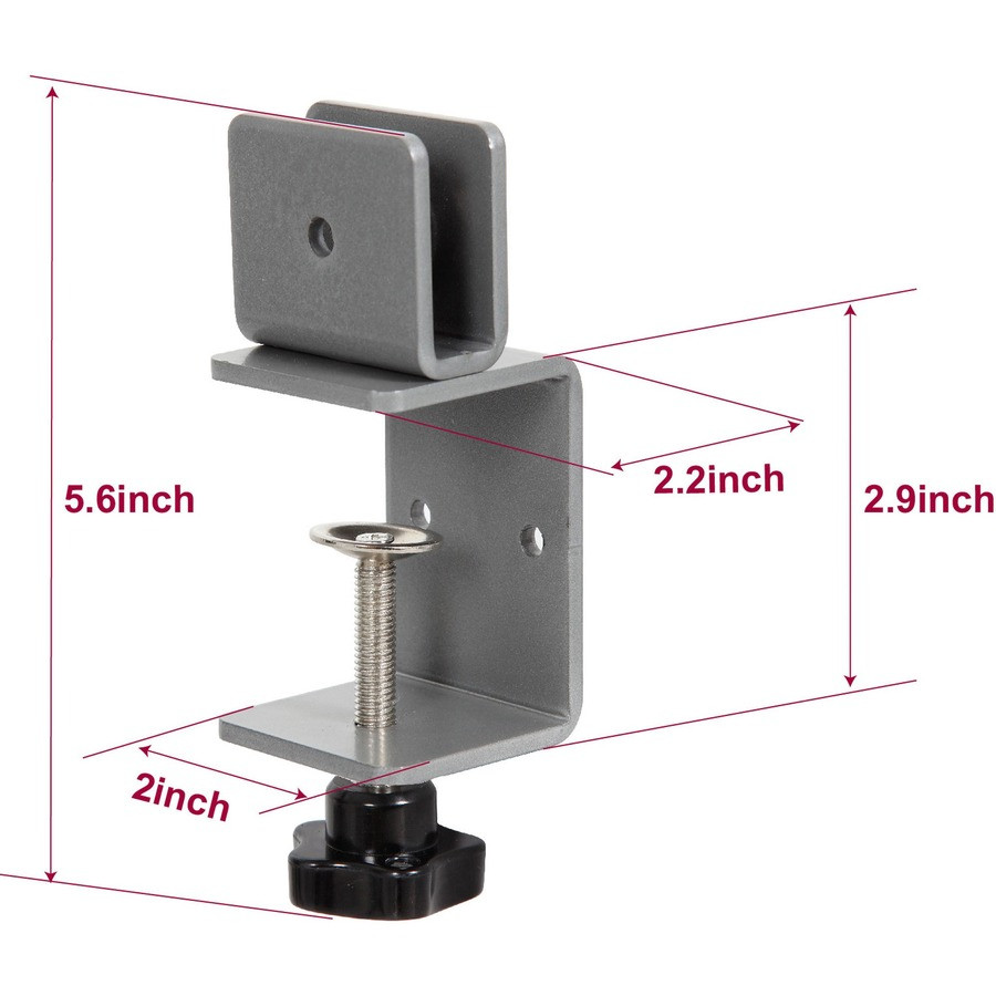 Sturdy brackets secure acrylic panels in place on tables to help protect employees, visitors and customers from respiratory droplets. It is made of steel with a silver powder coating for durability. The bottom part clamps onto tabletops/worksurfaces up to 2" thick. Top part clamps panels up to 3/8" thick. Set of two brackets comes with a knob and screws for mounting.