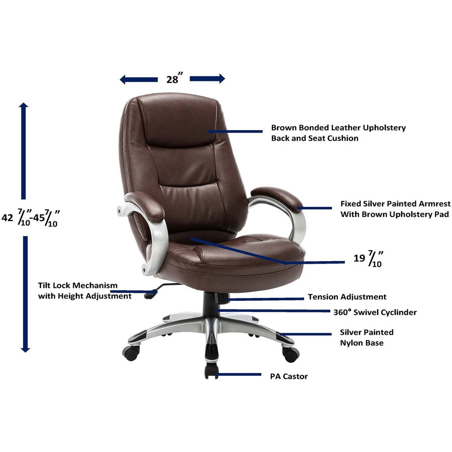 Executive high-back chair, part of the Lorell Westlake Series, features bonded leather upholstery with overstuffed cushions, a waterfall seat and padded arms for exceptional comfort. Functions include pneumatic seat-height adjustment (18-1/4" to 21-3/4"), 360-degree swivel, tilt, tilt tension, and tilt lock. Polyurethane frame offers a champagne-colored, powder-coat finish. Seat cushion measures 21" wide x 20-1/2" deep. Back cushion size is 21" wide x 29-1/4" high. Arm height from the floor adjusts from 26-3/4" to 30-1/4". High-back chair meets or exceeds applicable ANSI/BIFMA standards. Meets the CA117 fire-retardant standard.