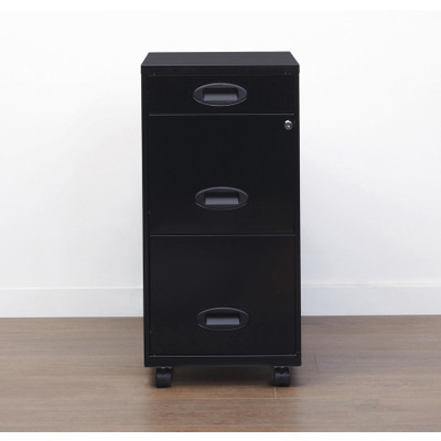 Vertical file cabinet features three file drawers with smooth-glide suspension to store your important documents. The three full high-side drawers accommodate letter-size, hanging file folders. The lock secures the two top drawers. SOHO File Cabinet also includes an 18" depth, chrome pull handles and steel construction with a baked enamel finish.
