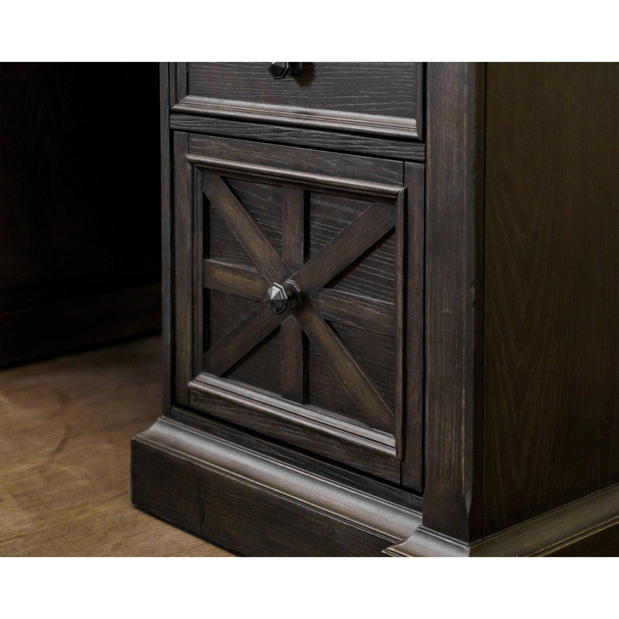 Kingston Credenza includes five utility drawers and two locking letter-size file drawers to keep your office essentials organized and secure. Convenient power center with AC outlets and USB 2.0 ports powers your devices. Kingston Office Collection emanates an air of sophistication with an old English style. Dark chocolate, rub-through finish is softly worn to enhance the wood for a naturally aged look. Durable wood with antique-like style is the perfect addition to any office space for a professional, unique touch. Crisscross designs and mottled hardware create a detailed, eye-drawing piece.