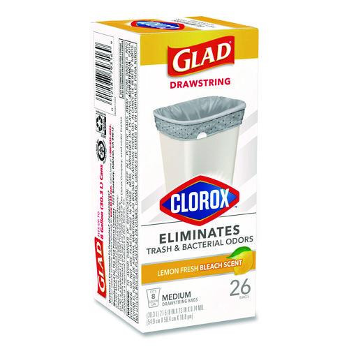 Medium Drawstring Trash Bags With Clorox, 8 Gal, Lemon Fresh Bleach Scent, 0.74 Mil, 23" X 21.63", Gray, 26/box