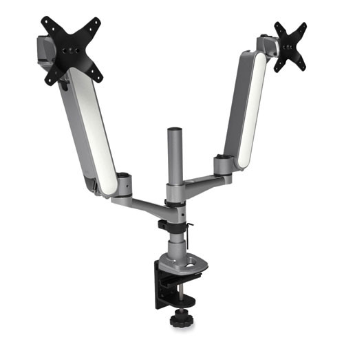 Multi-directional Dual Monitor Arm, For 30" Monitors, 360 Deg Rotation, 105 Deg Tilt, 360 Deg Pan, Silver/wh, Supports 20 Lbs