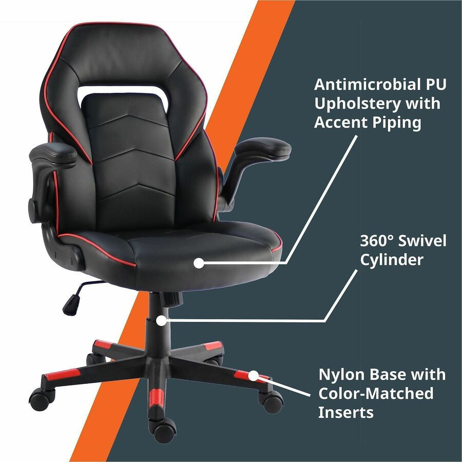 SpawnSafe Gaming Chair with Antimicrobial Upholstery thoughtfully combines personalized, ergonomic comfort with tasteful style for the ultimate desk chair. Antimicrobial PU upholstery allows easy cleaning and comes with accent piping for added style and a pop of color. Upholstered and padded armrests offer extra comfort, or can be flipped up out of your way. Easily personalize the comfort level of your chair with the Tilt Tension and Seat-Height adjustment features. Lock your personal tilt and seat-height settings into place with the specialized locking mechanism. Swivel Cylinder sitting just above the chair's base allows you to swivel a full 360-degrees. Nylon base comes with color-matched inserts and moves on 2" smooth-rolling hooded casters. Seat depth measures 18.1".