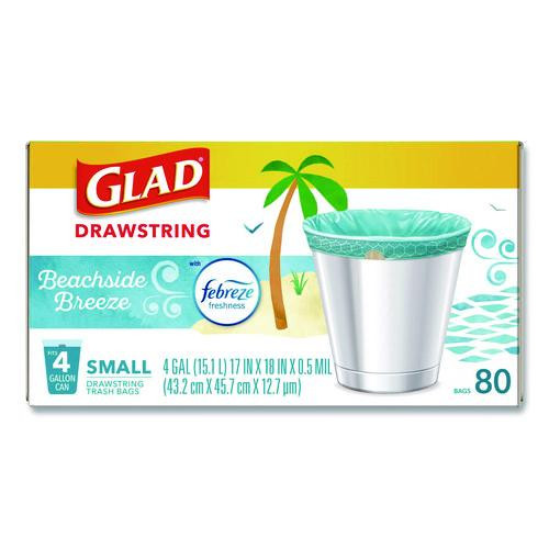 Glad OdorShield Drawstring Small Trash Bags with Febreze provide strength plus odor control, to keep your home smelling fresh. These small garbage bags are made with OdorShield technology and Febreze freshness to provide continuous odor neutralization, based on time lapse technical evaluation. Featuring a blue hue and printed design around the internal ring of the bag, these trash bags add an aesthetic touch to any room when it is folded around the edge of the can. These trash bags in a fresh, airy scent fit small size trash cans and are great for in the bathroom, in home office, bedroom and laundry room.