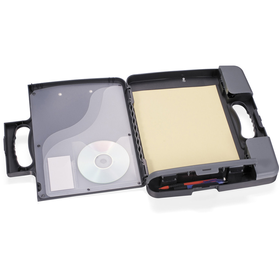Heavy-duty, portable clipboard case can be used as a briefcase. Built-in filing pockets are perfect for CDs, business cards and papers. Three separate compartments can be used for pens and other small items (one is magnetized to hold clips in place). Clipboard includes a low-profile clip, ergonomic hand grips and paper storage area. Unique hinge-and-clasp system assures many years of use.