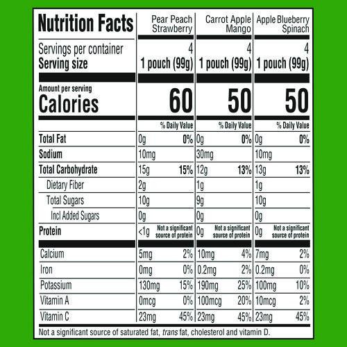 | Flavor: | Apple Blueberry Spinach; Carrot Apple Mango; Pear Peach Strawberry |