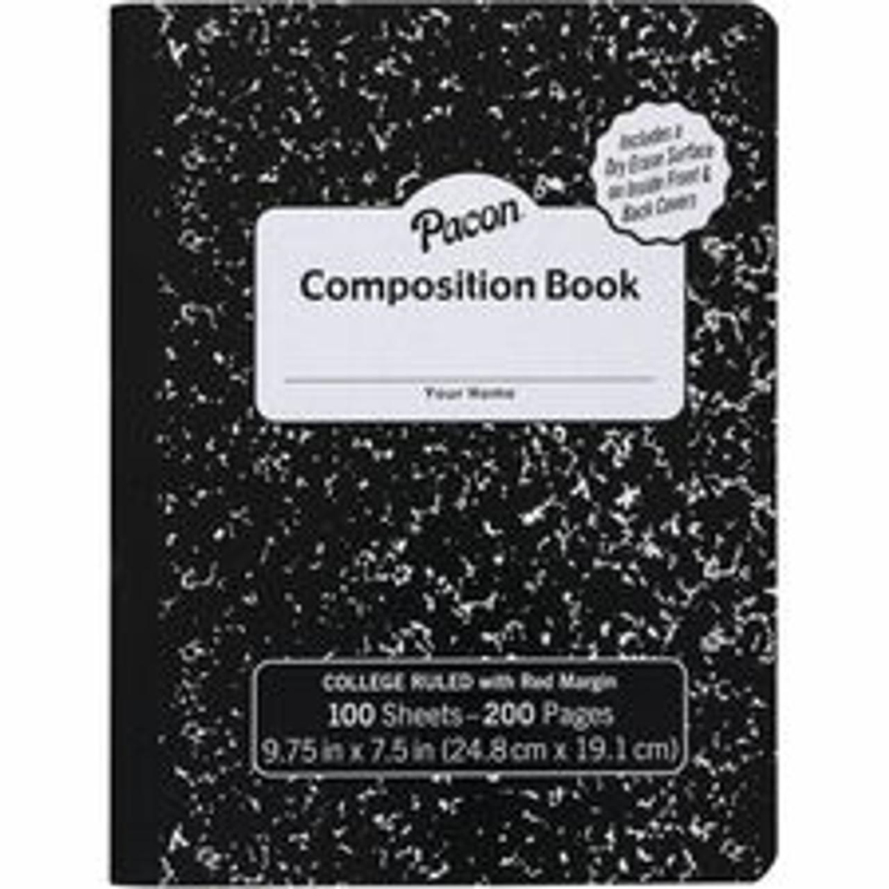 Pacon Marble Hard Cover College Rule Composition Book - 100 Sheets - 200 Pages - College Ruled Front Ruling - Red Margin - 9.75" Height x 7.5" Width - Black Marble Cover - Recyclable, Hard Cover - 1 Each