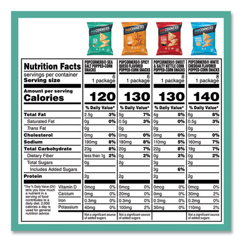 | Package Includes: | (7) Kettle Corn; (7) White Cheddar; (5) Sea Salt; (5) Spicy Queso; (4) Cinnamon Crunch |