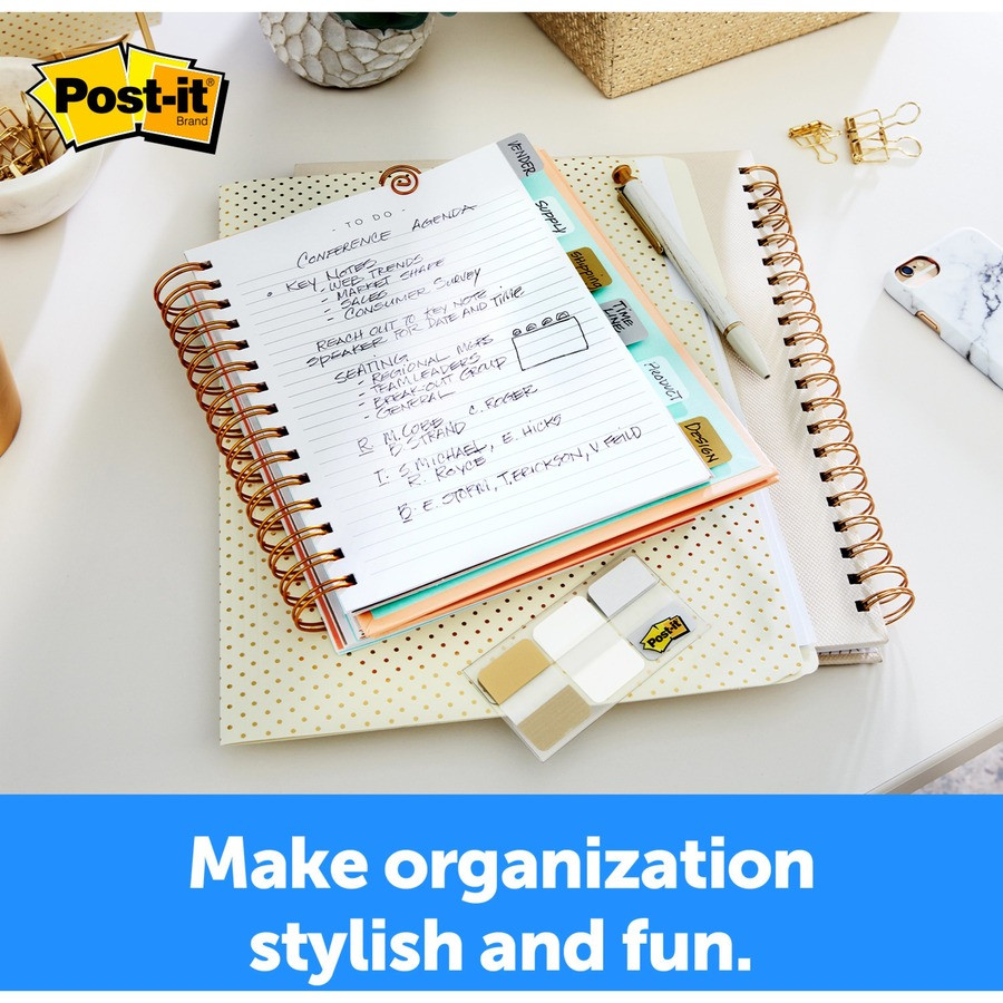 The Post-it Tabs fit right into your day planner to add design and make your important information stand out. Metallic colors stand out to help direct you or others to a saved page. They work great for planners, binders, file folders and textbooks as they stick securely but remove cleanly. 1" tabs offer plenty of space for labeling. Included convenient dispenser dispenses one tab at a time.