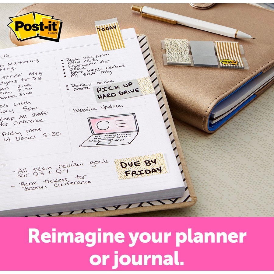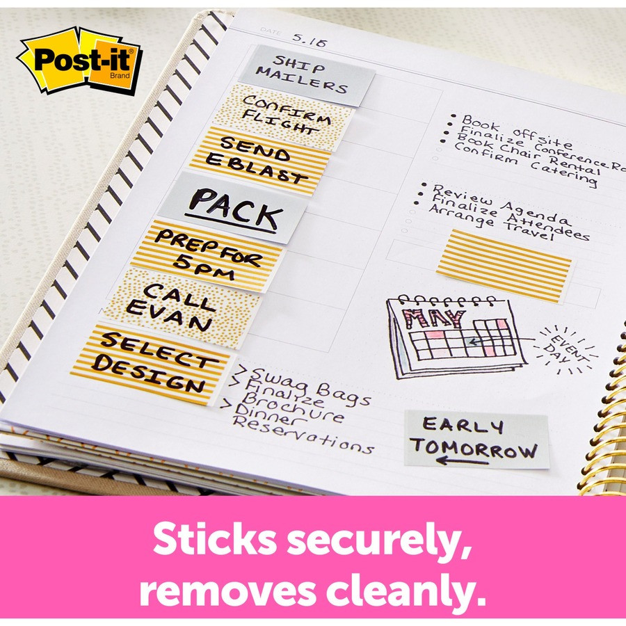 The Post-it Flags fit right into your day planner to add design and make your important information stand out. The metallic colors stand out to help direct you or others to a saved page. They work great for planners, binders, file folders and textbooks as they stick securely but remove cleanly. Removable adhesive lets you apply and remove flags to mark your place, tab and highlight information. Copy shows through flags. Write on flags to customize. Included dispenser dispenses one flag at a time.