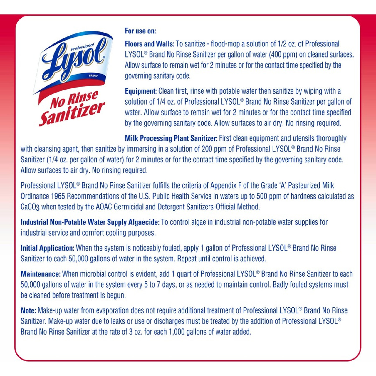 Professional Lysol No Rinse Sanitizer - For Sink, Floor, Wall, Bathtub, Food Service Area - Concentrate - 128 fl oz (4 quart) - Recommended For: Bacteria Remover, Fungi Remover, Virus Remover - Disinfectant, Anti-bacterial - 4 / Carton