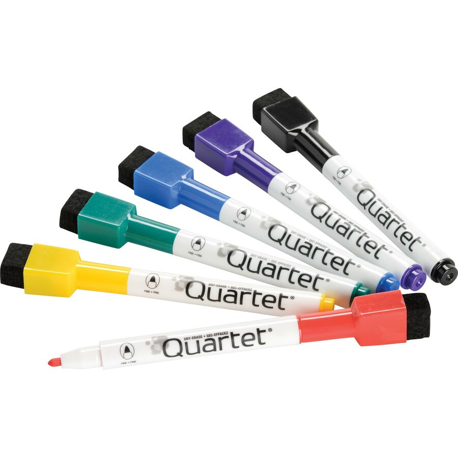 ReWritables Dry-Erase Markers each feature a magnet on the cap so the markers adhere to any metal surface for easy access. Quick corrections are easy with the cap-mounted eraser. Intensely colored, nontoxic ink erases easily, and the wide variety of colors allows you to choose an ink color to target an audience or to color-code information. Store low-odor markers in the convenient clear vinyl storage pouch. Fine tip is best for detailed writing on dry-erase calendars or small boards. Colors include black, red, blue, green, purple and yellow.