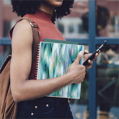 Add fabulous flair to planning with the Essential Weekly/Monthly Planner in striking Dramatic Floral design. Dated planning pages range 14 months from December to January. Two-page-per-week spreads include ruled daily entries from Monday to Sunday, numbered weeks, count of days/days remaining, holidays, moon phases, notes area and current and future months. Two-page-per-month spreads offer daily blocks from Sunday to Saturday. Tear-off corners help keep your place and faux printed monthly tabs for quick access on page edges. Flexible twin-wire binding and soft printed cover allow planner to fold back for a flat and sturdy writing surface. Extra bonus pages include quarterly planners for three years, dedicated contacts (phone/address/email) and notes sections. Eco-conscious planner is crafted from 100 percent post-consumer recycled fiber paper material.