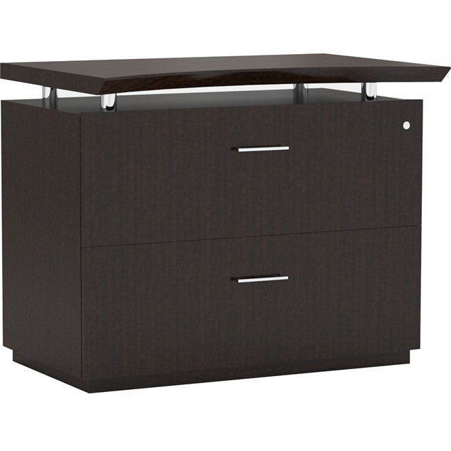 Freestanding Lateral File with floating top and chrome drawer pulls belongs to the Sterling Laminate Conference Collection with a bold design that is crafted with a contemporary decor in mind. Rich finish and distinctive curves showcase the beauty of this laminate line. Each file drawer holds letter-size and legal-size files. Locking lateral file can support Sterling Above-surface Storage Components. Chrome standoffs create a floating-top look.