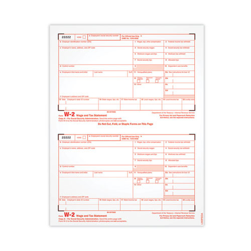 Single-Part W-2 Tax Form, Copy A, Fiscal Year: 2021, One-Part (No Copies), 8.5 x 5.5, 2 Forms/Sheet, 100 Forms Total