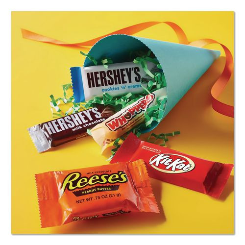 When only the best candy will do, look to the this assortment. Use this crowd-pleasing candy assortment to greet guests at your next party, stuff stockings and trick-or-treat bags, or just stock your lunch box with a Hershey®'s Chocolate favorite each day of the month. Finally, someone put together a bag of candy where every piece is a favorite. Pour some of this Hershey®'s assortment out and watch them disappear! Perfect for everyday snacking, holidays and parties. Individually wrapped for long-lasting freshness. A kosher assortment of Hershey®'s Chocolate candies. Food Type: Candy; Flavor: Hershey's Cookies 'n' Crème; Hershey's Milk Chocolate; Kit Kat Wafer Bars; Reese's Peanut Butter Cups; Whopper's Malted Milk Balls; Sugar Free: No; Vegan: No.