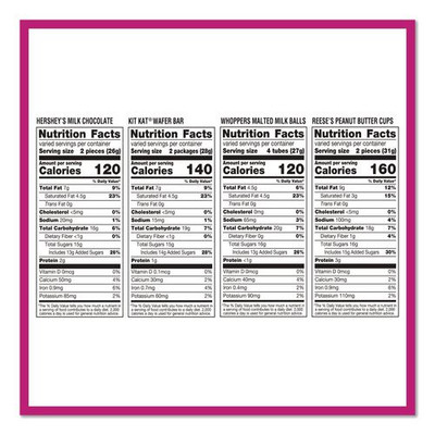 Flavor: Hershey's Cookies 'n' Crème; Hershey's Milk Chocolate; Kit Kat Wafer Bars; Reese's Peanut Butter Cups; Whopper's Malted Milk Balls