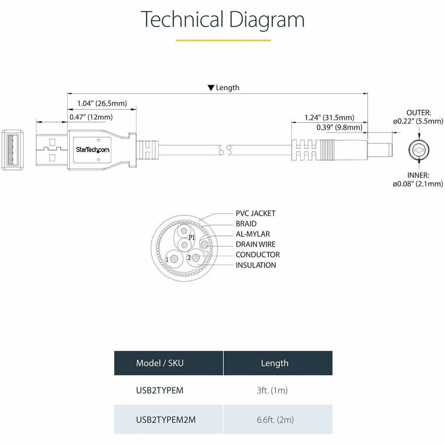 Tired of having to carry around a separate wall adapter in order to power or charge your 5V devices, such as certain external hard drives, streaming media players, and Bluetooth® speakers? This USB power cable makes it easier to power 5V DC devices that have a Type M (OD: 5.5mm, ID:2.1mm) barrel power connector. You can power or charge the devices through an available USB port on your laptop or desktop computer. Expertly designed and constructed of high-quality materials, the StarTech.com USB2TYPEM power cable is backed by our lifetime warranty.