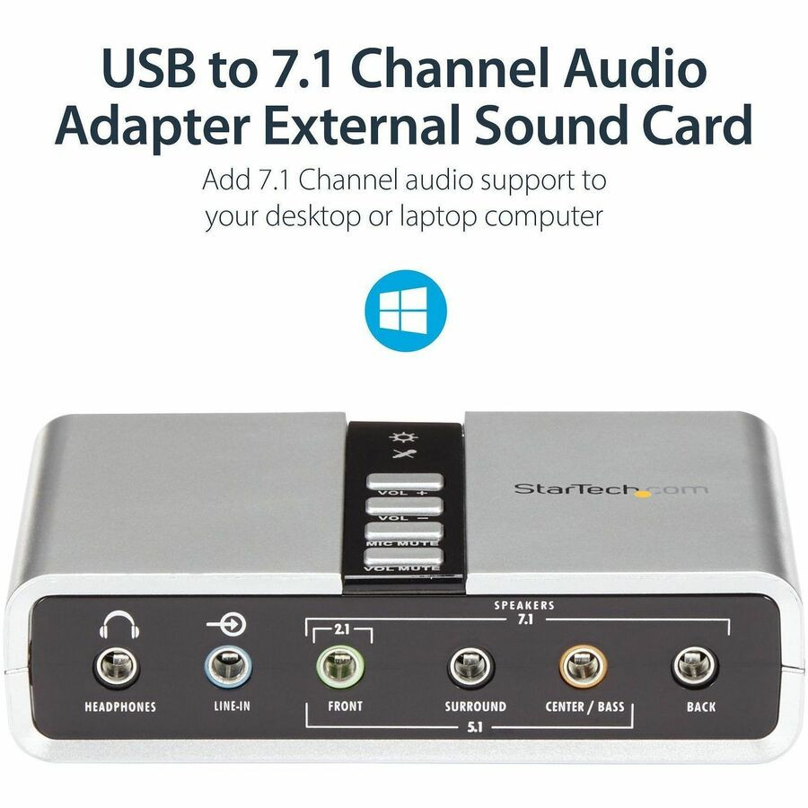 StarTech.com 7.1 USB Audio Adapter External Sound Card - 16 bit DAC Data Width - 7.1 Sound Channels - External - C-Media CM6206 - USB 2.0 - 48 kHz Maximum Playback Sampling Rate - USB - 1 x Number of Audio Line Out