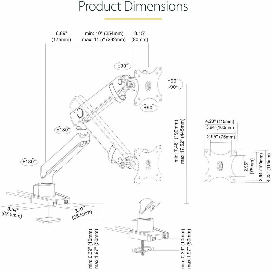 Free up space while creating an ergonomic work environment. This desk-mount monitor arm makes it easy to securely mount and adjust a 17" to 34" display above your desk. Adjust Your Monitor for Ideal Viewing The single arm monitor mount extends up to 18.4" (467 mm) so it's easy to find the right viewing angle. Swivel your monitor +90/-90 degrees or tilt your screen +90/-90 degrees for comfortable viewing. You can even rotate it 90 degrees for landscape or portrait viewing. One-Touch Height Adjustment With up to 17.5" (445 mm) of height adjustment, the slim monitor-mount arm features a mechanical spring that makes it easy to raise or lower your display offering a toolless adjustable height range of 10.1". Adjust the tension according to the weight of your monitor for effortless movement. Easy Installation The VESA mount monitor stand is easy to install (desk C-clamp or grommet mount) and offers built-in cable management and dual USB 3.0 port passthrough for connecting your computer. The detachable VESA mount makes it simple to attach your monitor. The Choice of IT Pros Since 1985 StarTech.com conducts thorough compatibility and performance testing on all our products to ensure we are meeting or exceeding industry standards and providing high-quality products to IT Professionals. Our local StarTech.com Technical Advisors have broad product expertise and work directly with our StarTech.com Engineers to provide support for our customers both pre and post-sales. ARMSLIM2USB3 is backed by a 2-year StarTech.com warranty and free lifetime technical support.