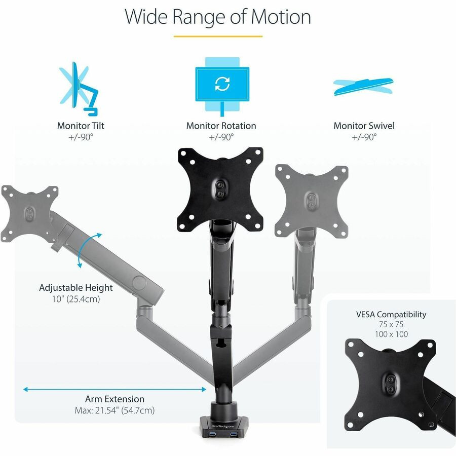 Free up space while creating an ergonomic work environment. This desk-mount monitor arm makes it easy to securely mount and adjust a 17" to 34" display above your desk. Adjust Your Monitor for Ideal Viewing The single arm monitor mount extends up to 18.4" (467 mm) so it's easy to find the right viewing angle. Swivel your monitor +90/-90 degrees or tilt your screen +90/-90 degrees for comfortable viewing. You can even rotate it 90 degrees for landscape or portrait viewing. One-Touch Height Adjustment With up to 17.5" (445 mm) of height adjustment, the slim monitor-mount arm features a mechanical spring that makes it easy to raise or lower your display offering a toolless adjustable height range of 10.1". Adjust the tension according to the weight of your monitor for effortless movement. Easy Installation The VESA mount monitor stand is easy to install (desk C-clamp or grommet mount) and offers built-in cable management and dual USB 3.0 port passthrough for connecting your computer. The detachable VESA mount makes it simple to attach your monitor. The Choice of IT Pros Since 1985 StarTech.com conducts thorough compatibility and performance testing on all our products to ensure we are meeting or exceeding industry standards and providing high-quality products to IT Professionals. Our local StarTech.com Technical Advisors have broad product expertise and work directly with our StarTech.com Engineers to provide support for our customers both pre and post-sales. ARMSLIM2USB3 is backed by a 2-year StarTech.com warranty and free lifetime technical support.