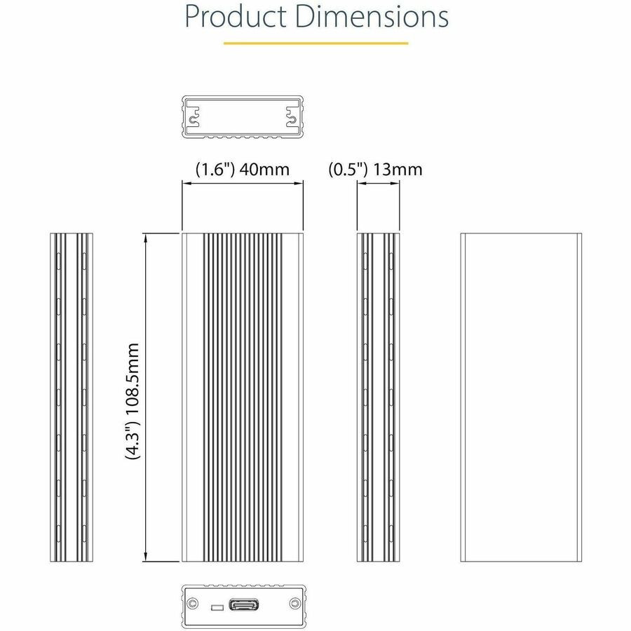 This compact M.2 NVMe SSD Enclosure for PCIe SSDs is a highly portable, high-performance data storage solution for your USB-C or Thunderbolt 3 enabled devices. Unparalleled Performance Leverage the high speeds of your M.2 NVMe drive, with this external SSD enclosure. It delivers USB 3.1 Gen 2 read/write speeds up to 10Gbps, which is nearly twice the capability of traditional M.2 SATA enclosures and USB 3.1 Gen 1. NVMe allows users to take full advantage of the throughput available to USB 3.1 Gen 2, which would not be possible with a SATA drive. This enclosure also features ventilation holes to help dissipate heat, ensuring an optimal operating temperature and helping to preserve performance. Truly Portable This slim, pocket-sized enclosure for PCIe based NVMe is specially designed for mobility, with a small form-factor design that fits easily into your laptop bag. Its lightweight, yet durable aluminum housing helps to ensure your drive won't be damaged while you're on the move. Broad Compatibility The M.2 NVMe enclosure works with tablets, laptops, desktop computers and hosts that are equipped with USB Type-C and Thunderbolt 3 ports. It's also backward compatible with USB 3.1 Gen 1, making it a convenient solution for the office or other workplace environments. Additionally, the enclosure supports plug-and-play installation, making it the perfect accessory for professionals on the go. M2E1BMU31C is backed by a StarTech.com 2-year warranty and free lifetime technical support.