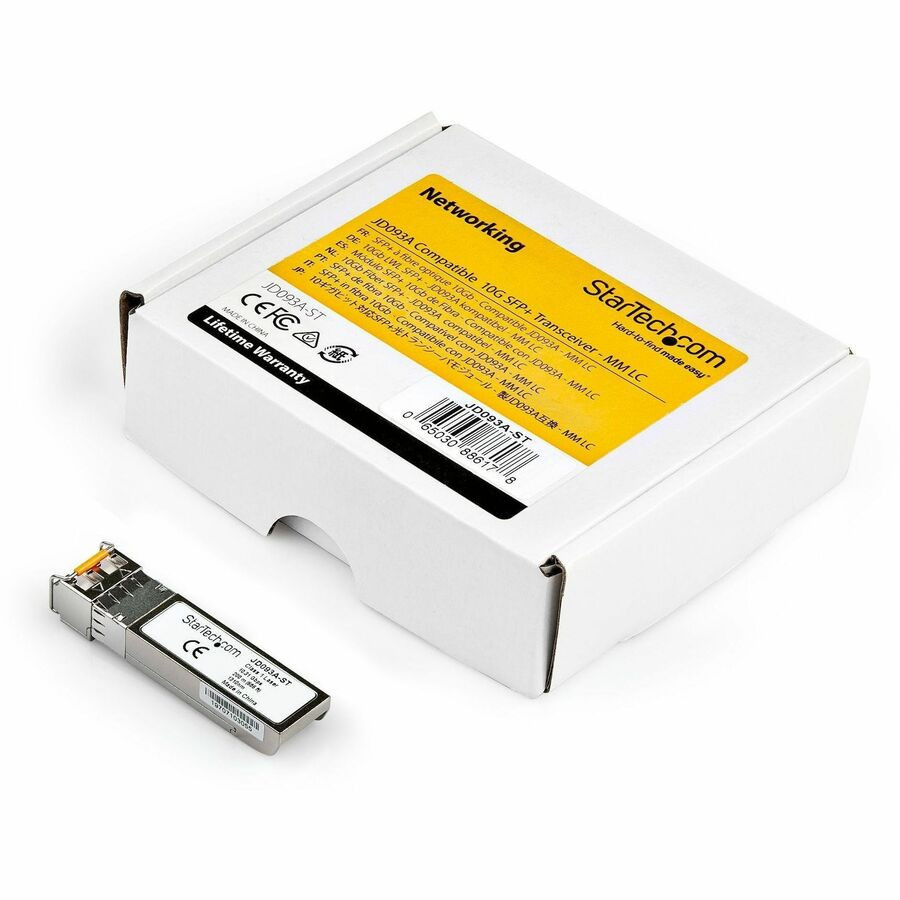 The JD093A-ST is a HP JD093B compatible fiber transceiver module that has been designed, programmed and tested to work with HP brand switches and routers. It delivers dependable 10 GbE connectivity over fiber cable, for 10GBase-LRM compliant networks, with a maximum distance of up to 200 m (656 ft). Technical Specifications: Wavelength: 1310nm Maximum Data Transfer Rate: 10 Gbps Type: Multi Mode Fiber Connection Type: LC Connector Maximum Transfer Distance: 200 m (656 ft) MTBF: 145,858,878 hours Power Consumption: < 1W Digital Diagnostics Monitoring (DDM): Yes This SFP+ fiber module is hot-swappable, making upgrades and replacements seamless by minimizing network disruptions. StarTech.com SFPs All StarTech.com SFP & SFP+ transceiver modules are backed by a lifetime warranty and free lifetime multilingual technical support. StarTech.com offers a wide variety of SFP modules and direct-attach SFP cables, providing the convenience and reliability you need to ensure dependable network performance.