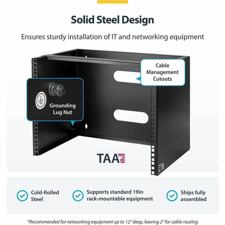 StarTech.com Wall-Mount Bracket for Shallow Rack-Mount Equipment - Solid Steel - 8U - For Patch Panel, LAN Switch - 8U Rack Height x 17.70" Rack Width x 12" Rack Depth - Wall Mountable - Black - Steel - 80.20 lb Maximum Weight Capacity - TAA Compl...