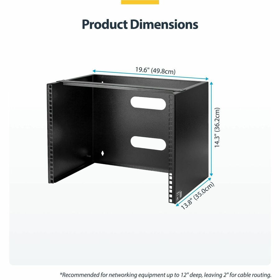 This wall-mount bracket provides 8U of space for mounting shallow rack-mount equipment that's 13.75 in. (34.93 cm) deep or less to the wall, such as patch panels or network switches. Improve efficiency and accessibility in your workspace The 8U rack optimizes your working space by efficiently mounting your shallow equipment on your wall instead of taking up desk space or other usable surface areas. It's the perfect solution for your space-limited SoHo (small office, home office) environment or server room because it doesn't take up any floor space. Ensure a secure and hassle-free installation The wall rack is constructed of solid steel to ensure a sturdy and safe mounting solution for your mission-critical equipment. Also, because the wall rack's mounting holes are positioned 16 in. apart, it exactly matches standard drywall construction framework to ensure simple and secure wall-stud anchoring. The rack also features a rear access panel that can be used to easily run cabling into the rack. Cage nuts and screws are included with the wall-mount bracket, to save you the hassle of sourcing separate mounting hardware. If you're looking for a shallow mounting solution with fewer or more rack units, StarTech.com also offers a 6U wall-mount bracket, and a 12U wall-mount bracket. The WALLMOUNT8 is backed by a StarTech.com lifetime warranty and free lifetime technical support. More from the Manufacturer