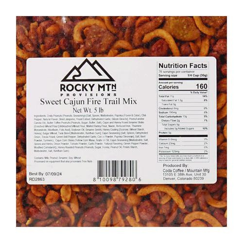 Mountain Manufacturing™ has an affinity for the good stuff. The stuff that gives you the energy to enjoy your day by taking away the hunger that distracts you. At Mountain Manufacturing™, they make their mixes for the people who break at river crossings and for those who take a break from crossing tasks off a list. You can count on them to keep you full so you can focus on the good stuff in your life. So, grab a bag and enjoy the nutty, sweet, salty, Cajuny, fruity mixes wherever you are. Get snacking. Food Type: Trail Mix, Nuts & Seeds; Flavor: Sweet Cajun Fire Roasted; Capacity (Weight): 80 oz; Sugar Free: No.