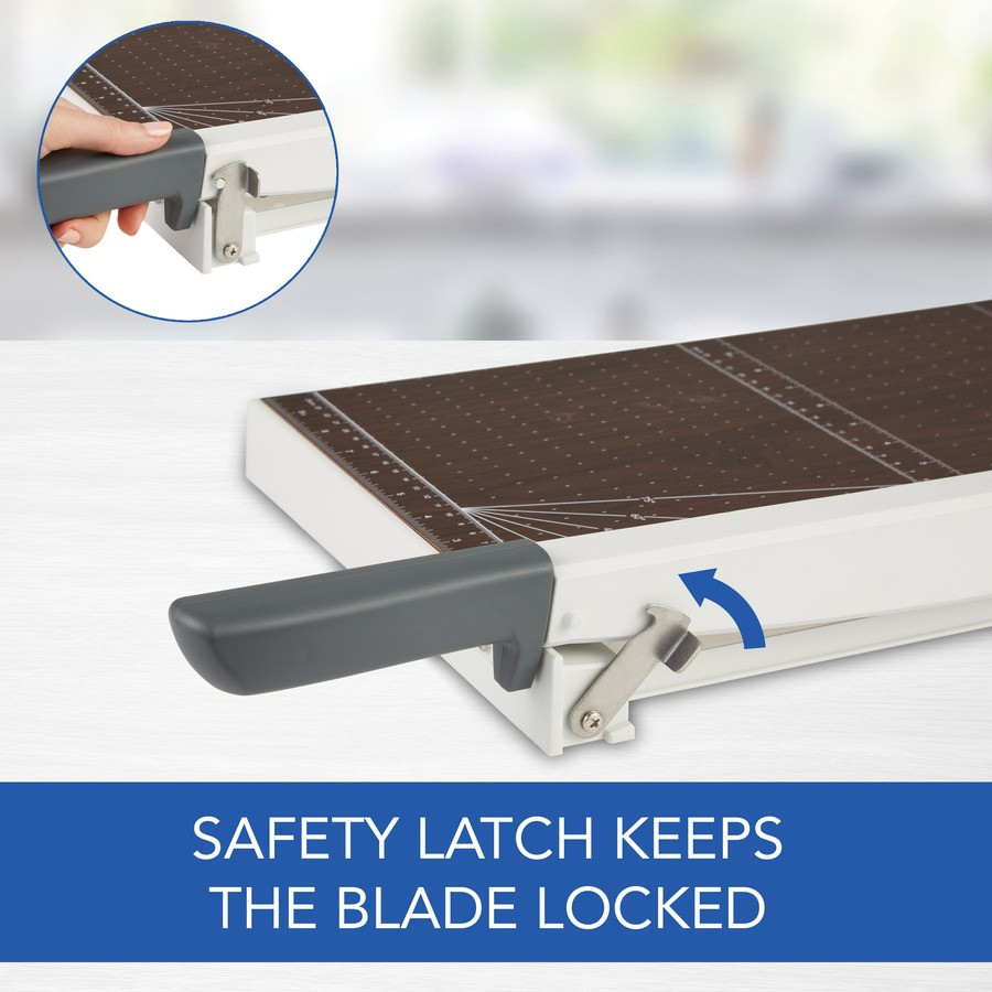 Create clean, professional cuts for your papers, photos and artwork with this ClassicCut Guillotine Trimmer. It has a solid wood surface and EdgeGlow LED lighting to help you achieve a clean, accurate cut every time. EdgeGlow LED light guide illuminates the edge of the trimmer to show exactly where cuts will be made. Solid wood surface is printed with alignment guides to help improve trimming accuracy. Guillotine blade has 15" cutting length and cuts up to 10 sheets at once. Safety latch keeps blade in place when not in use. Trimmer includes three AAA batteries.