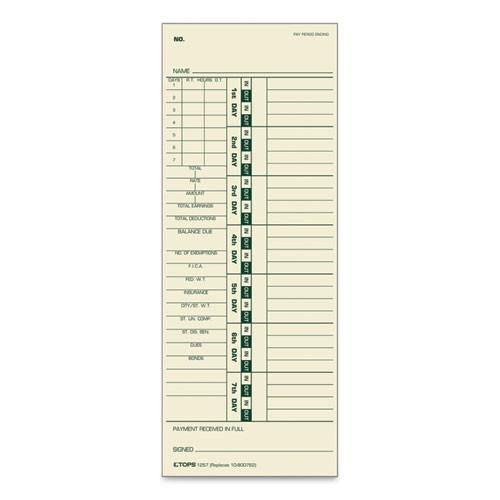 | Special Features: | Manila Stock Printed Green on Front-With area to calculate regular hours, extra hours, deductions, gross and net pay per week. Prints red on back. |