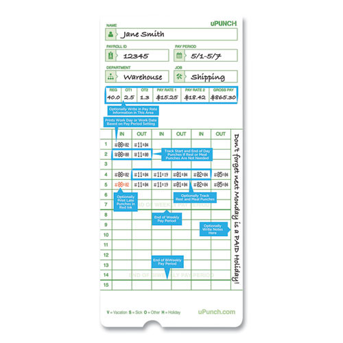 Time Clock Cards For Upunch Hn3000, Two Sides, 7.37 X 3.37, 50/pack