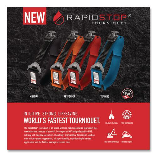 The RapidStop™ Tourniquet is an award-winning hemostatic solution designed for rapid, single-handed application in life-threatening bleeding emergencies. Developed at MIT and refined by EMS, military, and industry experts, it delivers the world's fastest occlusion time while providing military-grade durability and suitability for patients of all ages. Bandages Type: Tourniquet; Material(s): High-Strength Polymer; Nylon; Velcro; Mounting Details: RAPIDSTOP™ Nylon Tourniquet Holder (Sold Separately); Length: 7.5".