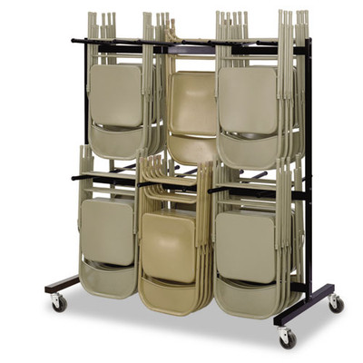 A space-saving storage solutio that holds up to 84 folding chairs. Durable black powder coat steel construction for durability. 4" casters for easy mobility enables use across any work environment.