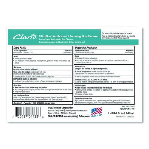 UltraBlue Antibacterial Foaming Skin Cleanser Refill, Fragrance-Free, 1,000 mL, 6/Carton