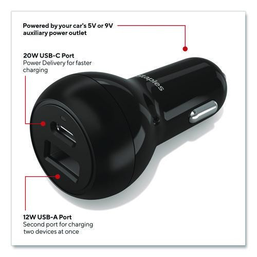 USB-A/USB-C Car Charger, 32 W, Two Ports, Black
