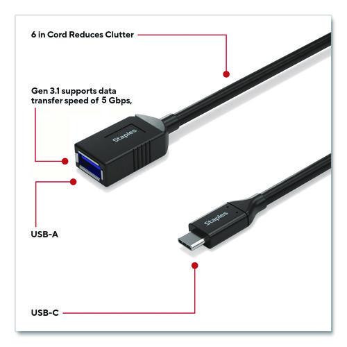 Fast changing technology means new devices are not always compatible with older models. The Staples TECH USB-C to USB-A adapter converts a USB-C input to a USB-A input and ensures you can maintain connectivity between all your devices, regardless of make or model. Delivering transfer speeds of 5 Gbps, this adapter promises a fast and reliable connection. Featuring a compact 6" cord, this adapter will keep your space clutter free. Cable Type: USB-C to USB A; Connector/Port/Interface: USB-A; USB-C; For Device Type: USB-C Devices; Cable Length: 6".