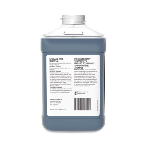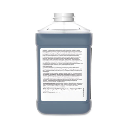 A one-step, quat-based disinfectant cleaner concentrate providing broad spectrum disinfection at 1:256 dilution. Use in healthcare and other facilities where cleaning and prevention of cross-contamination are critical. Bactericidal, virucidal and fungicidal. Kills MRSA and VRE. Meets bloodborne pathogen standards for decontaminating blood and body fluids. For use with J-Fill dispensers. Application: Colleges; Floors; Hotels; Nonporous Surfaces; Nursing Homes; Plastic Surfaces in Hospitals; Schools; Walls; Applicable Material: Plastic; Porcelain; Chemical Compound: Didecyl Dimethyl Ammonium Chloride; Ethyl Alcohol; Lauryl Dimethyl Amine Oxide; Sodium Sesquicarbonate; Tetrasodium Salt of EDTA; n-Alkyl Dimethyl Benzyl Ammonium Chloride; Scent: Minty.
