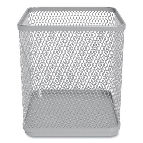 Keep your workspace organized. Single compartment keeps writing utensils and small office tools in one central location. Square design with flat rounded edges gives your desktop a contemporary look. Features tightly woven mesh construction for added durability. Pencil Cup Type: Wire Mesh; Color(s): Silver; Color Family: Silver; Material(s): Wire Mesh.