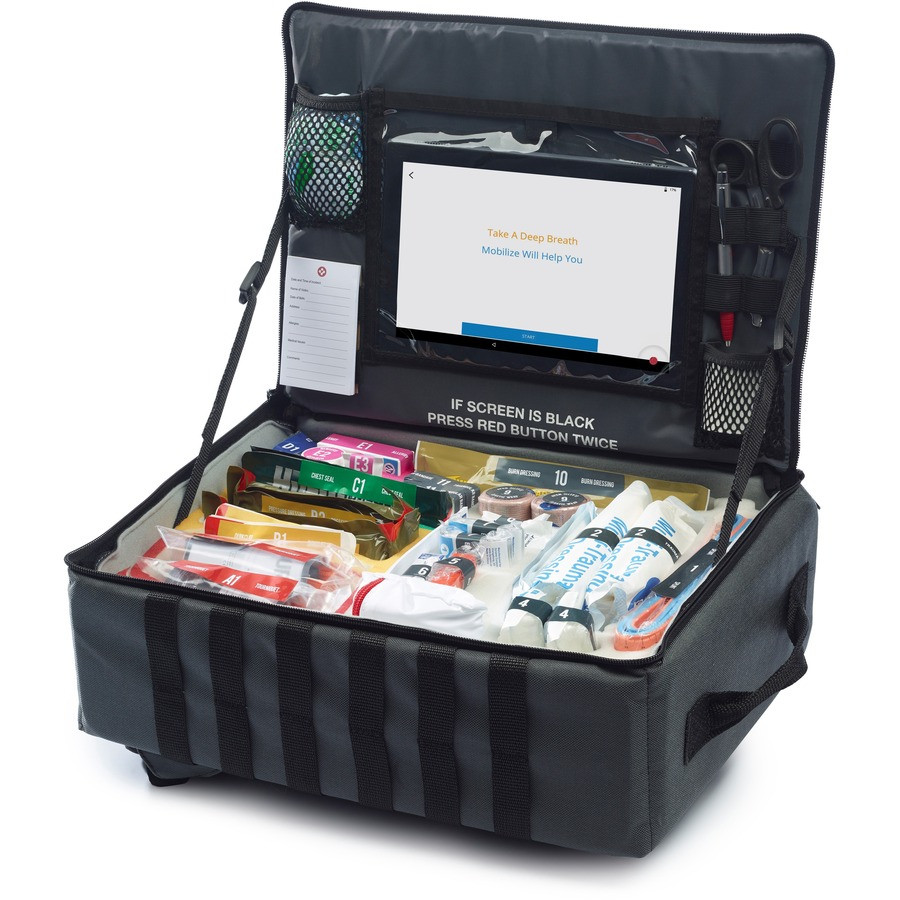 In addition to an extensive set of OSHA-compliant medical supplies to help manage life-threatening conditions, the Mobile Rescue System features a built-in tablet for easier access to Zoll's Mobilize Rescue app to empower bystanders to help save lives while treating multiple victims. The app provides real-time, interactive instructions on how to assess, monitor/manage care and deliver treatment using the medical supplies (more than 35 types) in the included, durable, military-grade nylon backpack for this MRS. Clearly organized and color-coded supplies with alphanumeric labels correspond to the instructions in the app. Treat severe bleeding, seizures and choking as well as more common injuries such as broken bones, allergic reactions and burns while emergency responders are on the way. The app also creates a time-stamped summary of actions to share with EMS. Use in large organizations such as schools, industrial workplaces, mining, construction and energy sector.